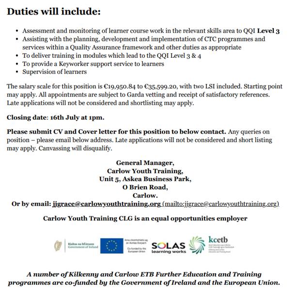 Carlow Youth Training (CYT) is a Community Training Centre (CTC), which, in association with Kilkenny and Carlow Education and Training Board (KCETB), provides vocational, educational and life skills training to early school leavers (16-21 years) using a learner centred approach. Our courses are designed to enable the learner to reach their full potential at their own pace. Our learners are supported to achieve new skills as well as the certification necessary for progression into employment, further training or continued education. The role of CTC Instructor responds to learner needs through the provision of flexible training options, which ultimately supports their move into the workplace, or further learning environments.