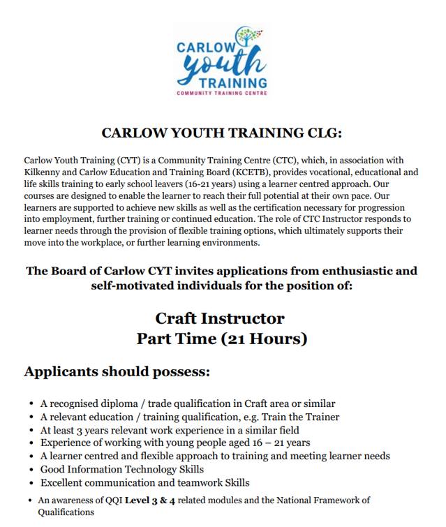 Apply Here: Carlow Youth Training: Craft Instructor (Part Time) | activelink