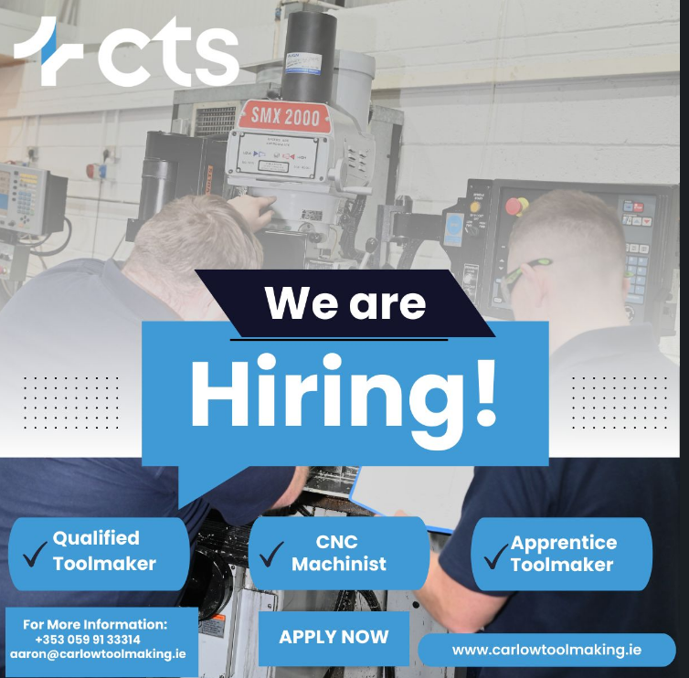 Toolmakers & MachinistsApril 4, 2025/in Manufacturing / Engineering, Trades / Operative / Manual Full Time Carlow TownCarlow Toolmaking Services are hiring for the following positions: apprentice toolmaker toolmaker CNC Machinist If interested please forward on your CV to aaron@carlowtoolmaking.com https://carlowchamber.com/contentwp/uploads/2025/04/Screenshot-2025-04-04-141457.png 742 754 ChamADM https://carlowchamber.com/contentwp/uploads/2018/05/chamber-logo-300x84.jpg ChamADM2025-04-04 13:21:062025-04-04 13:21:06Toolmakers & Machinists