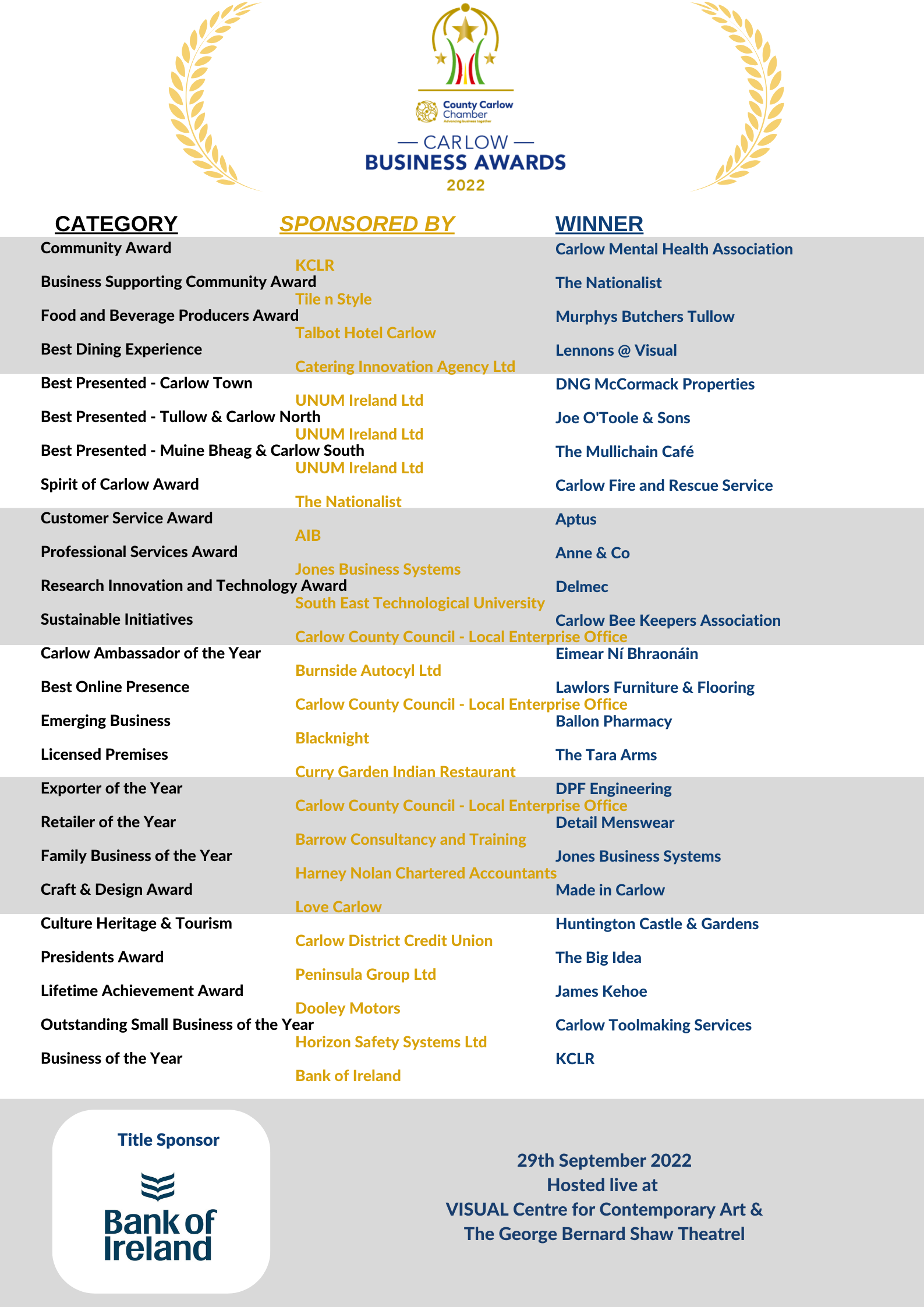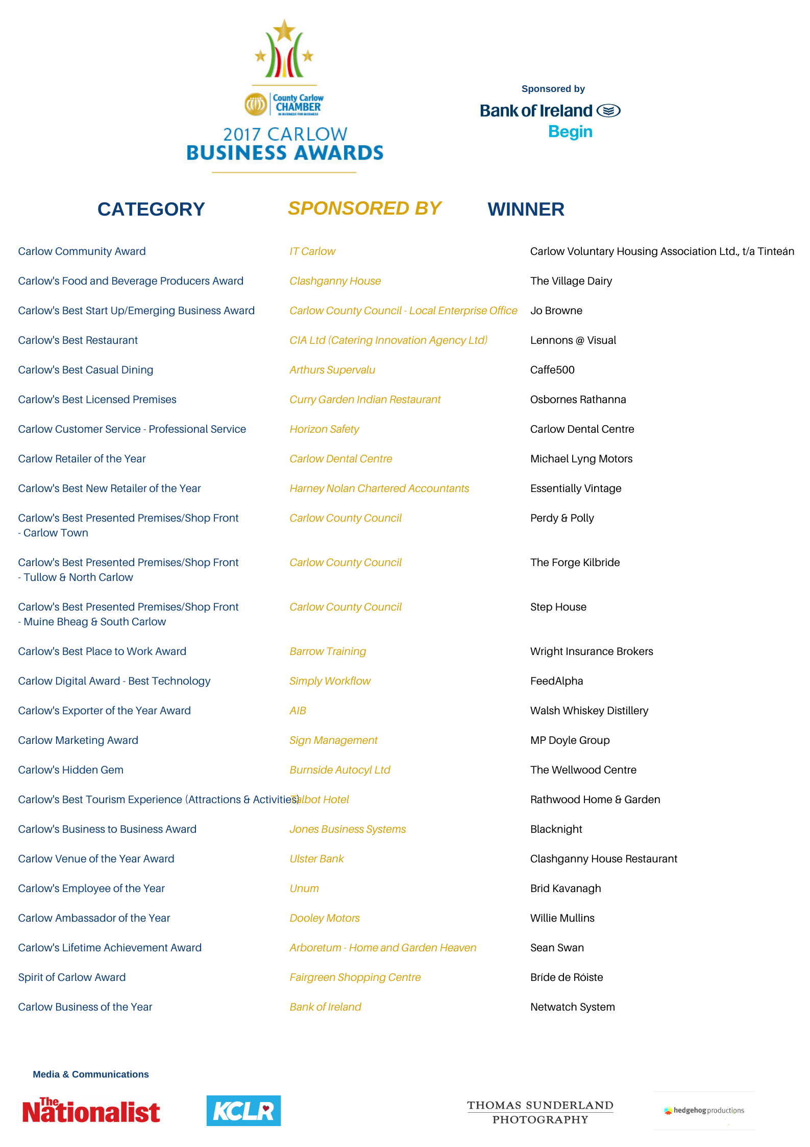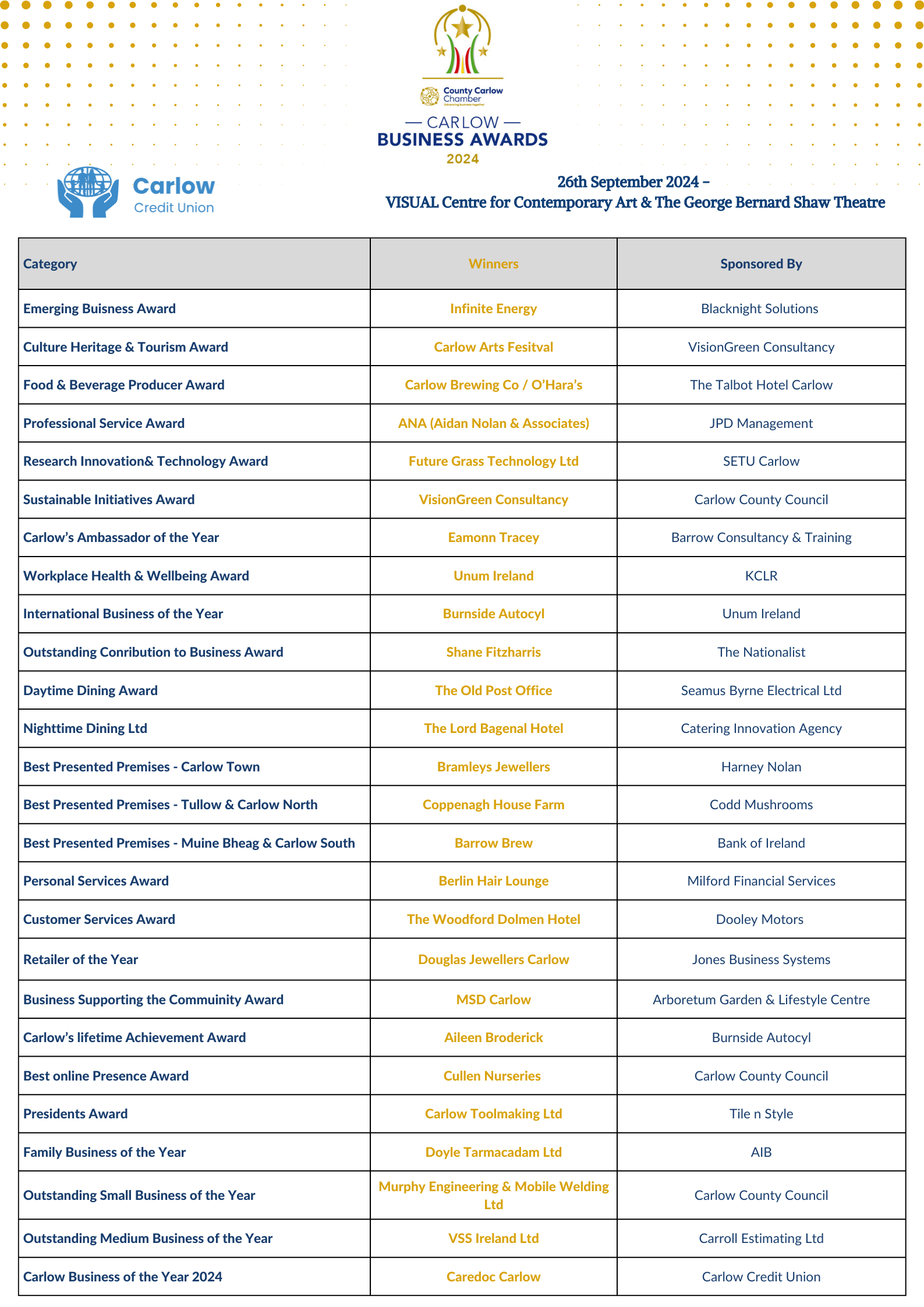 The Carlow Business Awards celebrates excellence across a wide range of categories on an annual basis with all finalists being taken through a rigorous selection process before the winner of each category is selected.
