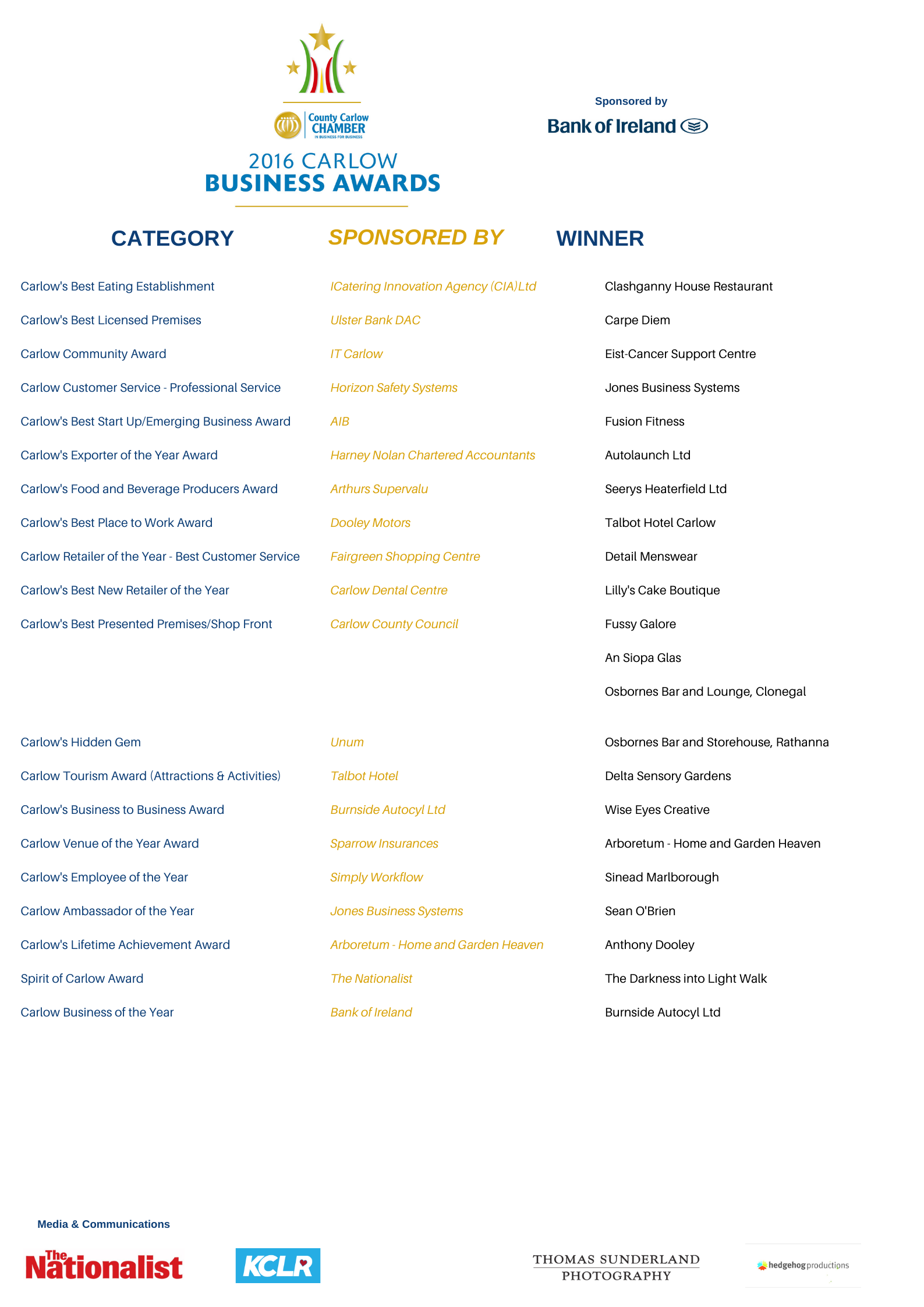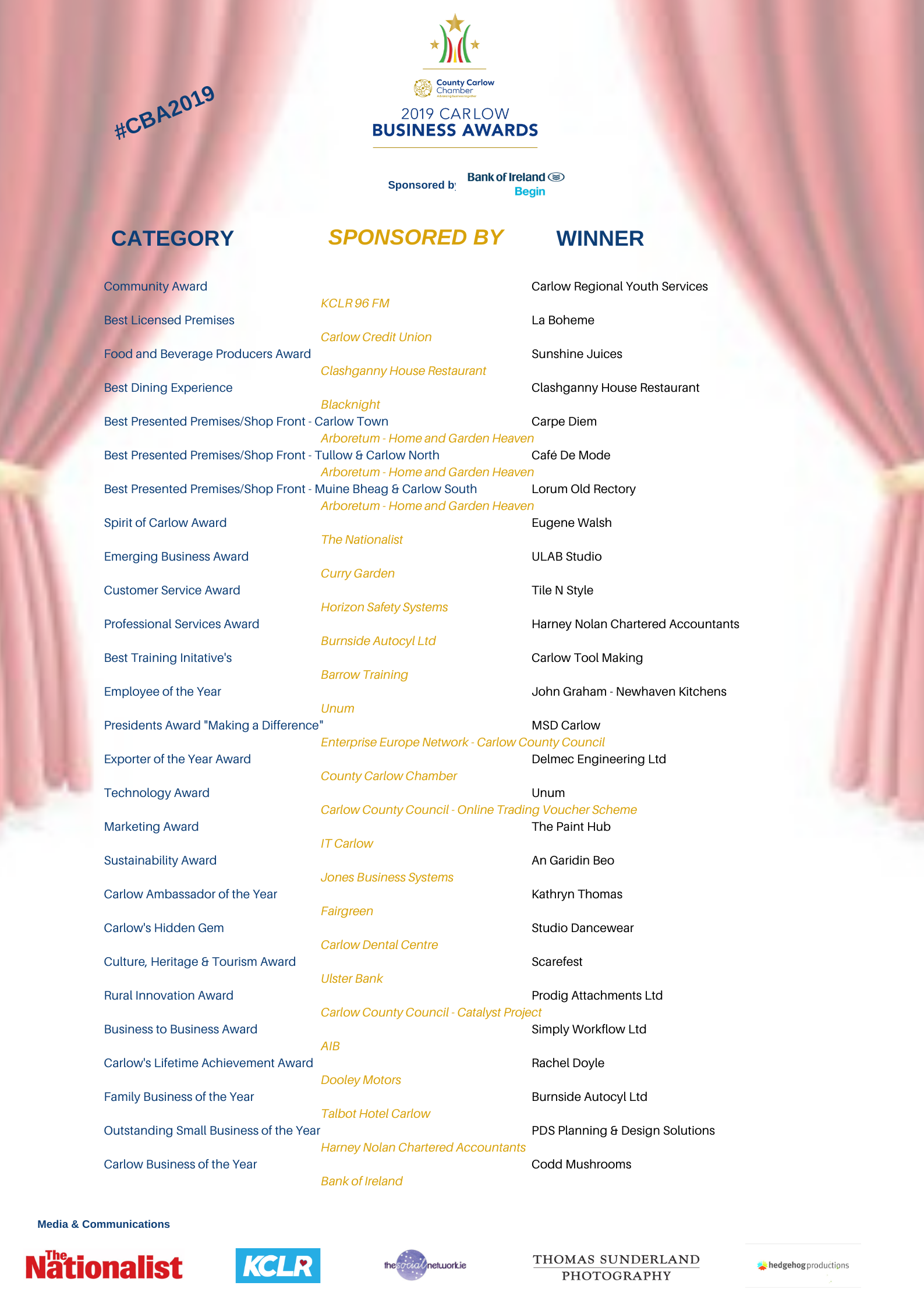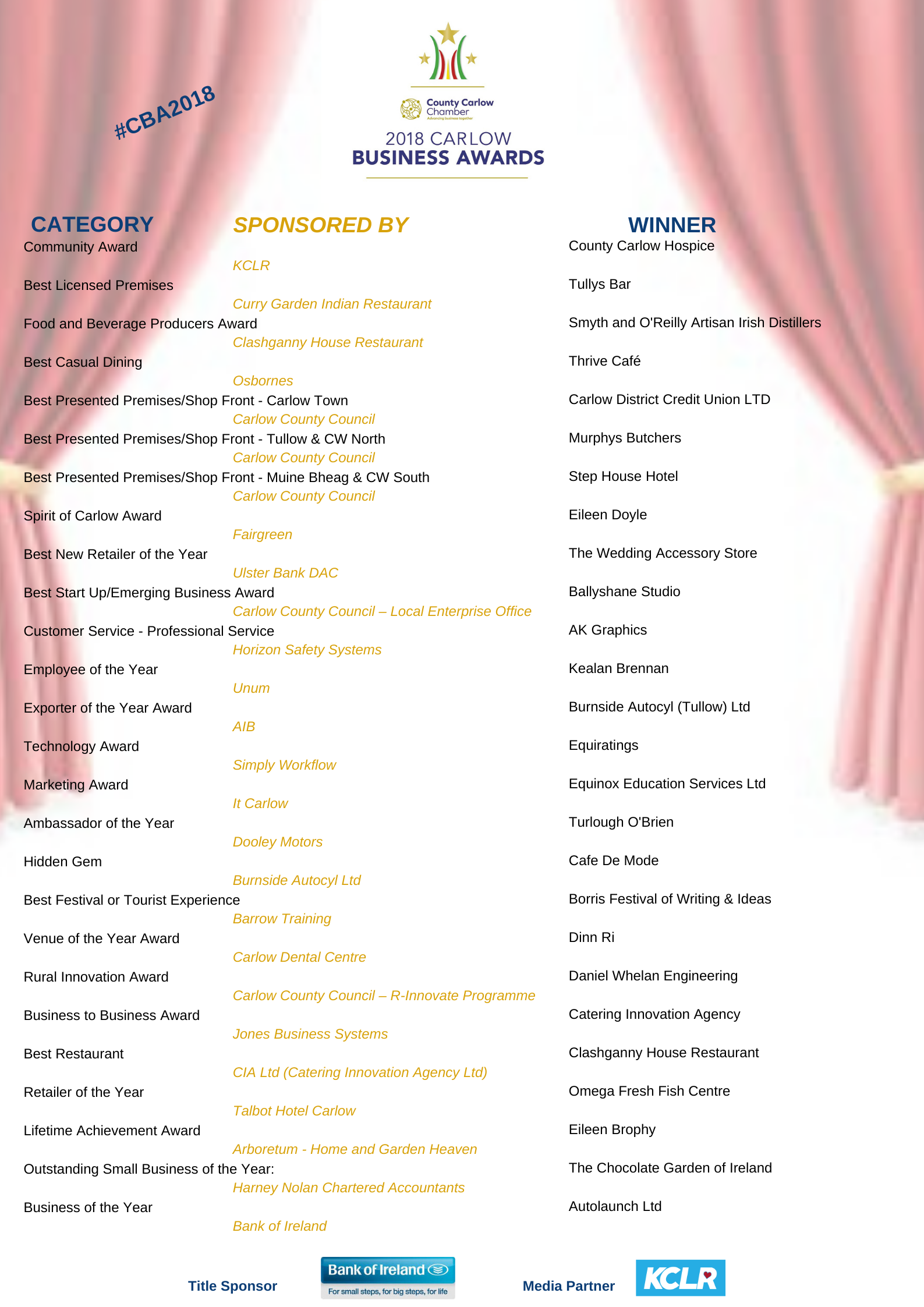 The Carlow Business Awards celebrates excellence across a wide range of categories on an annual basis with all finalists being taken through a rigorous selection process before the winner of each category is selected.