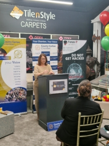 ‘It was great to see so many businesses at the event today in Tile N Style – networking is such a key component for every business.  Thanks to Bernard and his team for hosting us – and for going to such trouble to make us all feel welcome.  Well done to Eveline for giving a clear overview of the key issues that businesses need to consider – and for giving us all some practical next steps on strengthening our online security.’ Says Norah Ryan, President of County Carlow Chamber of Commerce.