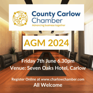 Your participation at the AGM is important for the Chamber, and we would encourage every member to take part in the meeting. As County Carlow Chamber is member-driven we value your input and suggestions and so would urge you to join us on Friday, 7thJune. It will be particularly useful and informative for new members. The AGM is an opportunity to meet other Chamber Members, learn about the Chamber, its activities and its role in the business community. The AGM will commence at 6.30pm.