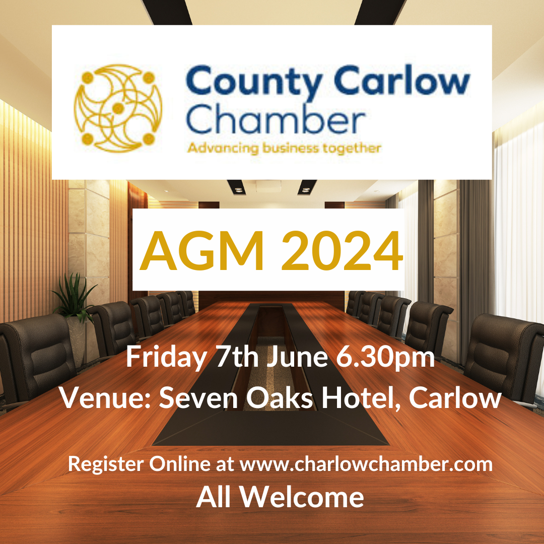 Notice is hereby given that the Annual General Meeting of County Carlow Chamber of Commerce CLG will be held at 6.30pm on Friday 7th June 2024 in The Seven Oaks Hotel, Carlow under the following Agenda: