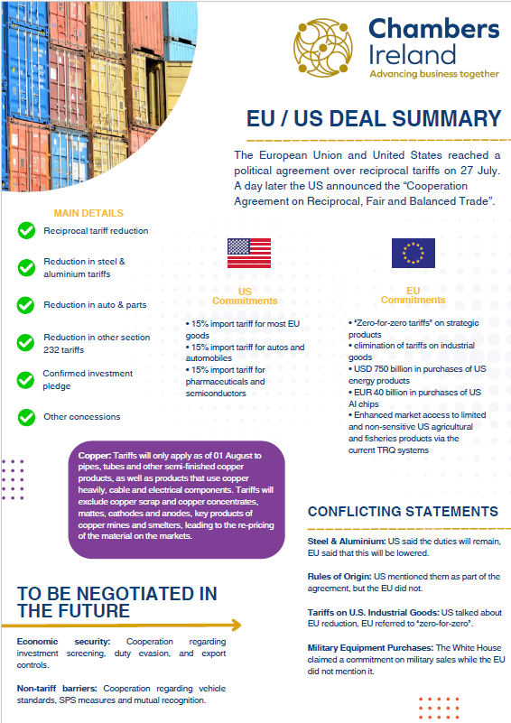 Chambers Ireland has welcomed the agreement on trade tariffs between the European Union and the United States.