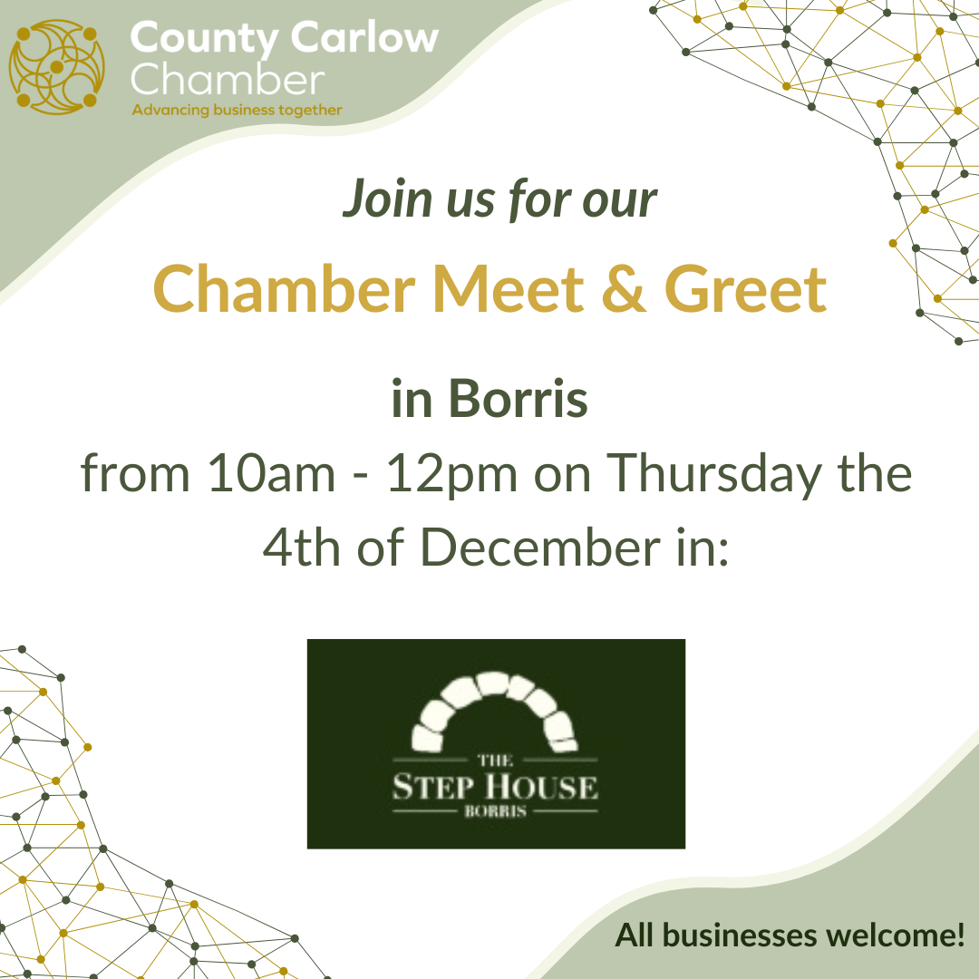 County Carlow Chamber of Commerce’s next ‘Chamber Meet & Greet’ will take place in the Step House Hotel on Thursday the 4th of December from 10am – 12pm.