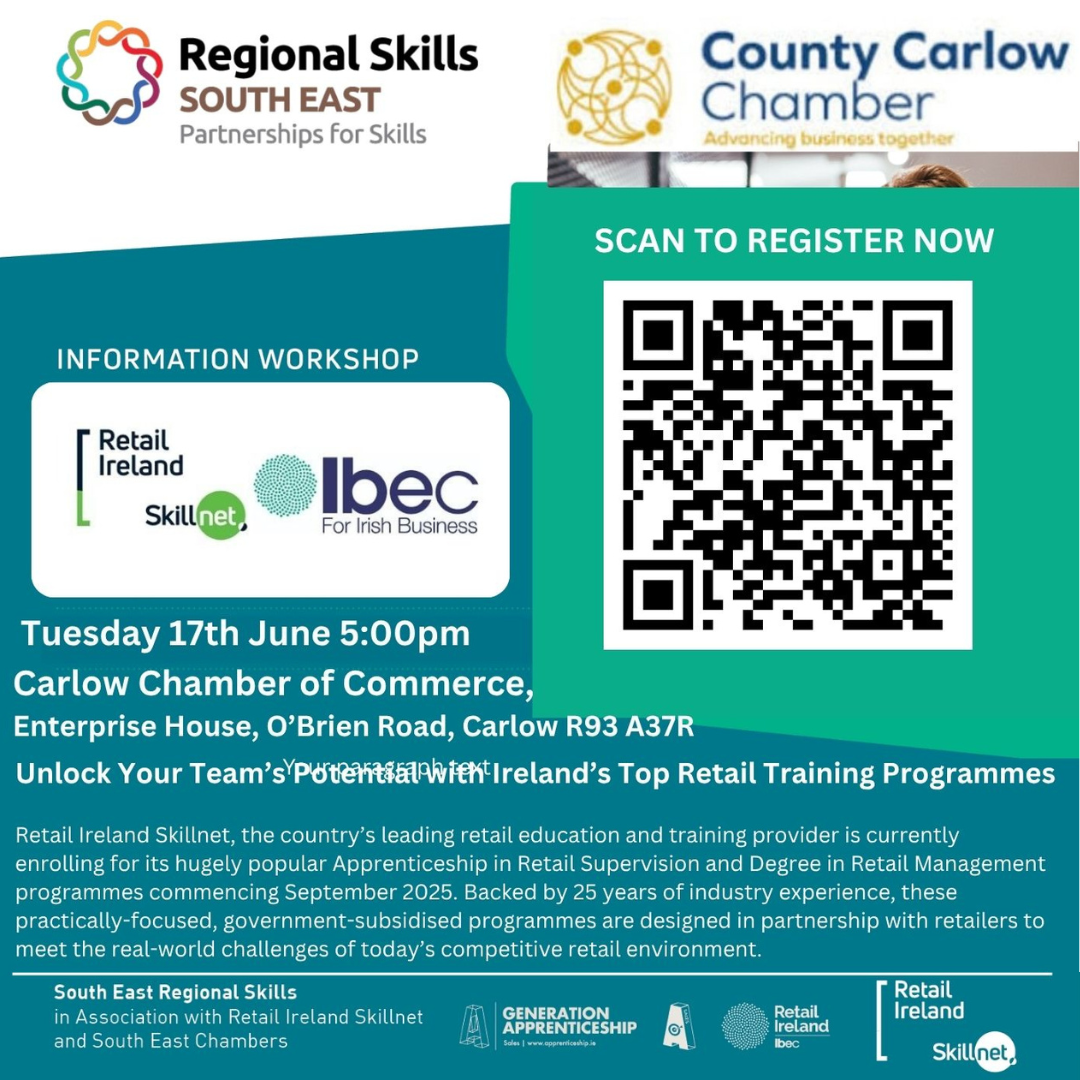 Carlow Chamber in collaboration with Retail Ireland Skillnet are delighted to invite retail employers and employees to a workshop discussing free and highly subsidised training and education programmes currently available to the Irish retail sector.