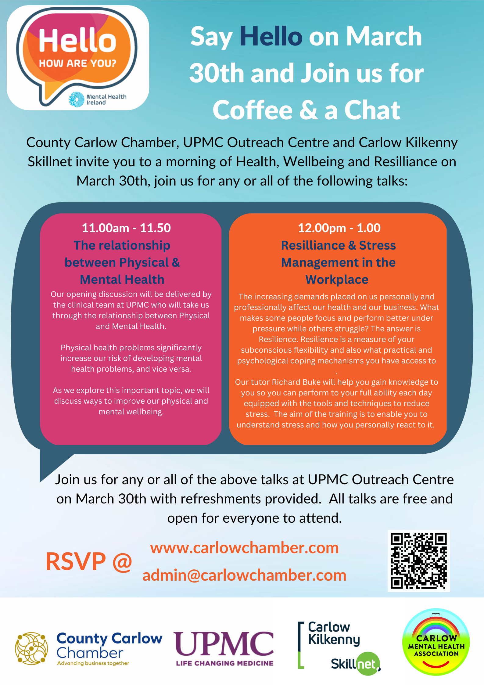 Mental and Physical health are so important both in work and home life. County Carlow Chamber in partnership with UPMC Outreach Centre and Carlow Kilkenny Skillnet are hosting a morning focused on Health, Wellbeing and Resilience on the 30th March,