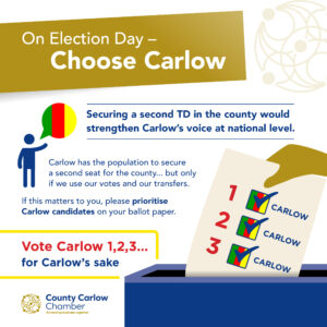 ‘Every vote counts. It is not just about giving your number 1 preference to Carlow candidates; it is equally important to consider giving your 2nd, 3rd, 4th or 5th preferences to Carlow candidates as well. By doing this you are securing the necessary transfers that can make all the difference in a tight race.’ Explains Nicola Doran, CEO of County Carlow Chamber of Commerce.