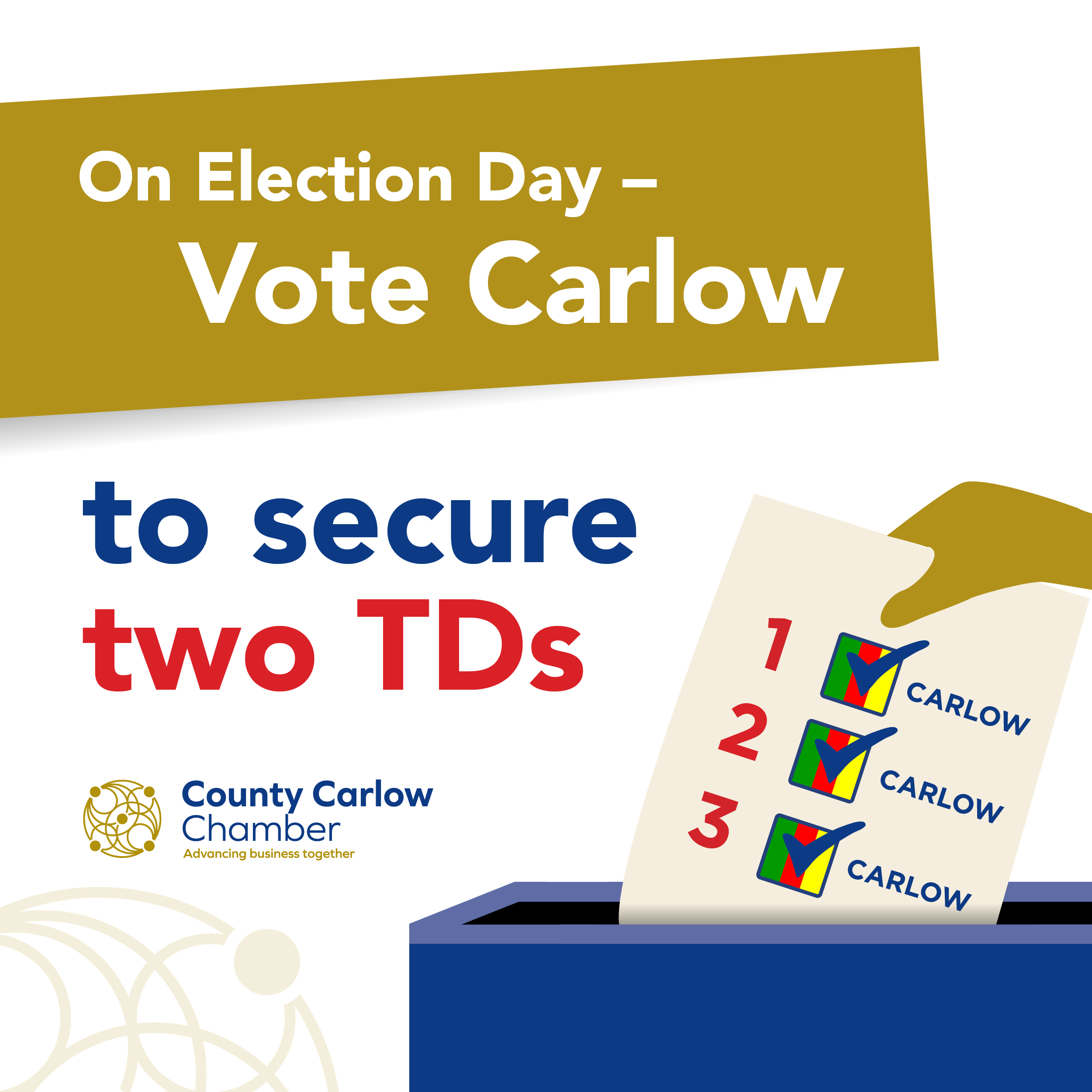 The Chamber is a member-based, apolitical organisation – not affiliated to any political party or individual. Their priority is championing county Carlow, and the businesses that they represent. They developed the Vote Carlow Campaign in response to a mandate from their members – 96% of those surveyed wanted to see a campaign to encourage voters to secure a second TD for the county.