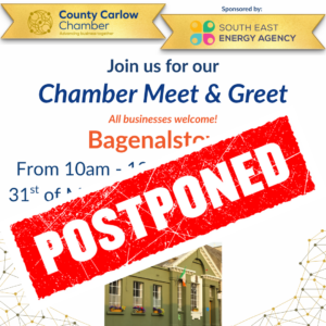 Please be aware that the Chamber Meet & Greet scheduled for the 31st of March in The Old Post Office Cafe in Bagenalstown has been postponed due to a road closure, as the premises will be closed for business from the 30th March to the 1st of April.